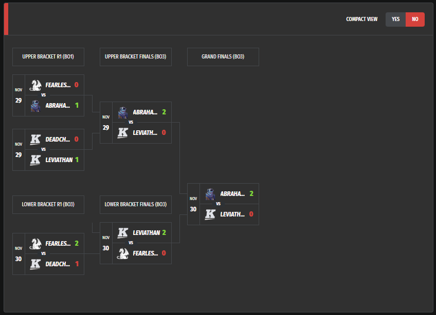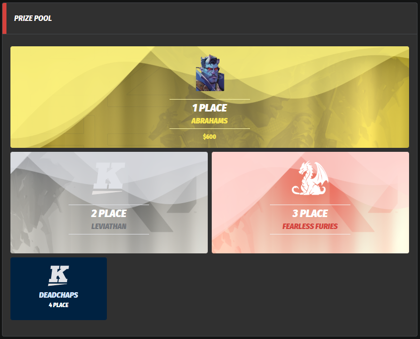 O segundo lugar foi para a equipe Leviathan, que chegou à final através da chave inferior, vencendo DEADCHAPS, mas no jogo decisivo não conseguiu enfrentar Abrahams. O terceiro lugar foi para Fearless Furies, e o quarto — DEADCHAPS.
