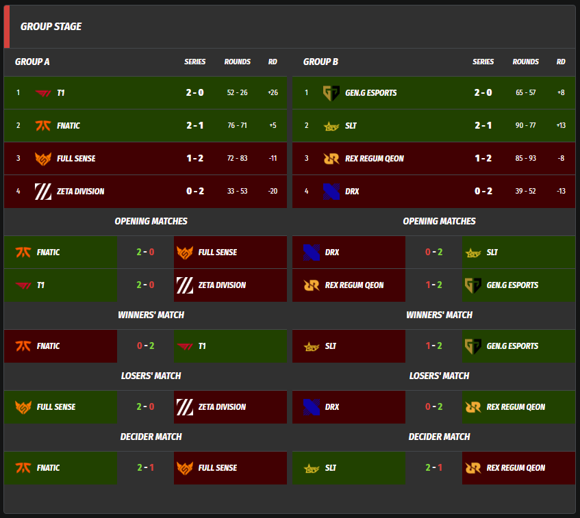 Fase de grupos: T1 dominou o grupo A, garantindo o primeiro lugar com um placar limpo de 2-0, à frente de seus principais rivais na chave — Fnatic, FULL SENSE e ZETA DIVISION.