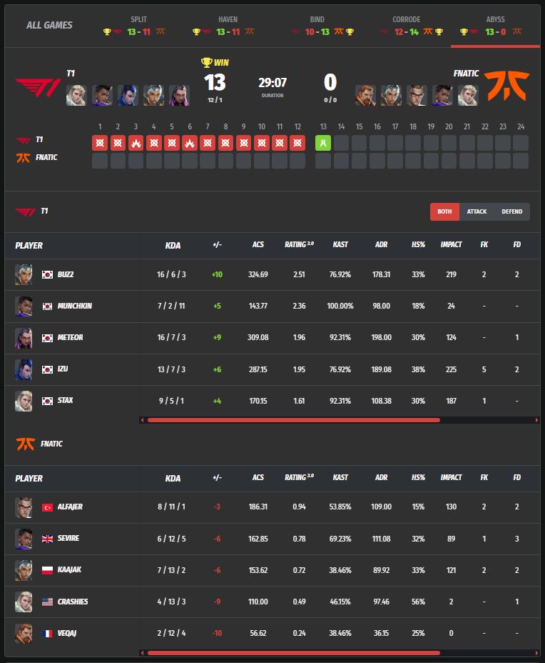 Tudo foi decidido no quinto e decisivo mapa Abyss. Aqui, T1 preparou uma verdadeira surpresa tática, entrando no mapa com uma seleção de personagens não convencional, incluindo três duelistas. Este movimento ousado desarmou completamente o adversário. Os coreanos jogaram o mapa de forma impecável, não dando nenhuma chance à Fnatic e conquistando uma vitória esmagadora com o placar de 13:0.